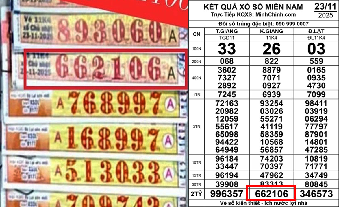 Những tờ có dãy số 662106 thuộc đài Kiên Giang trúng độc đắc xổ số miền Nam ngày 23 tháng 11