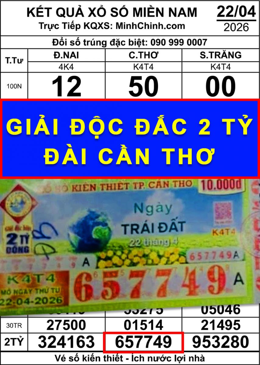 Theo chia sẻ từ đại lý vé số Đức Thịnh ở Cần Thơ, tờ vé may mắn có dãy số 657749 thuộc đài Cần Thơ mở thưởng ngày 22/4 đã trúng giải độc đắc trị giá 2 tỉ đồng, chưa trừ thuế.