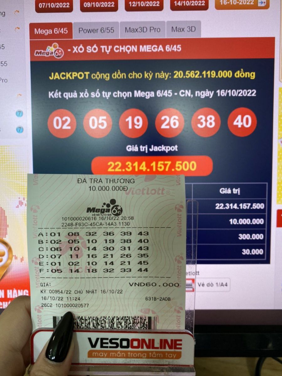 Tiếp đó, vào kỳ quay Vietlott Mega 6/45 ngày 16/10/2022, VESOONLINE cũng tìm ra thêm được chủ nhân giải Nhất trị giá 10 triệu đồng