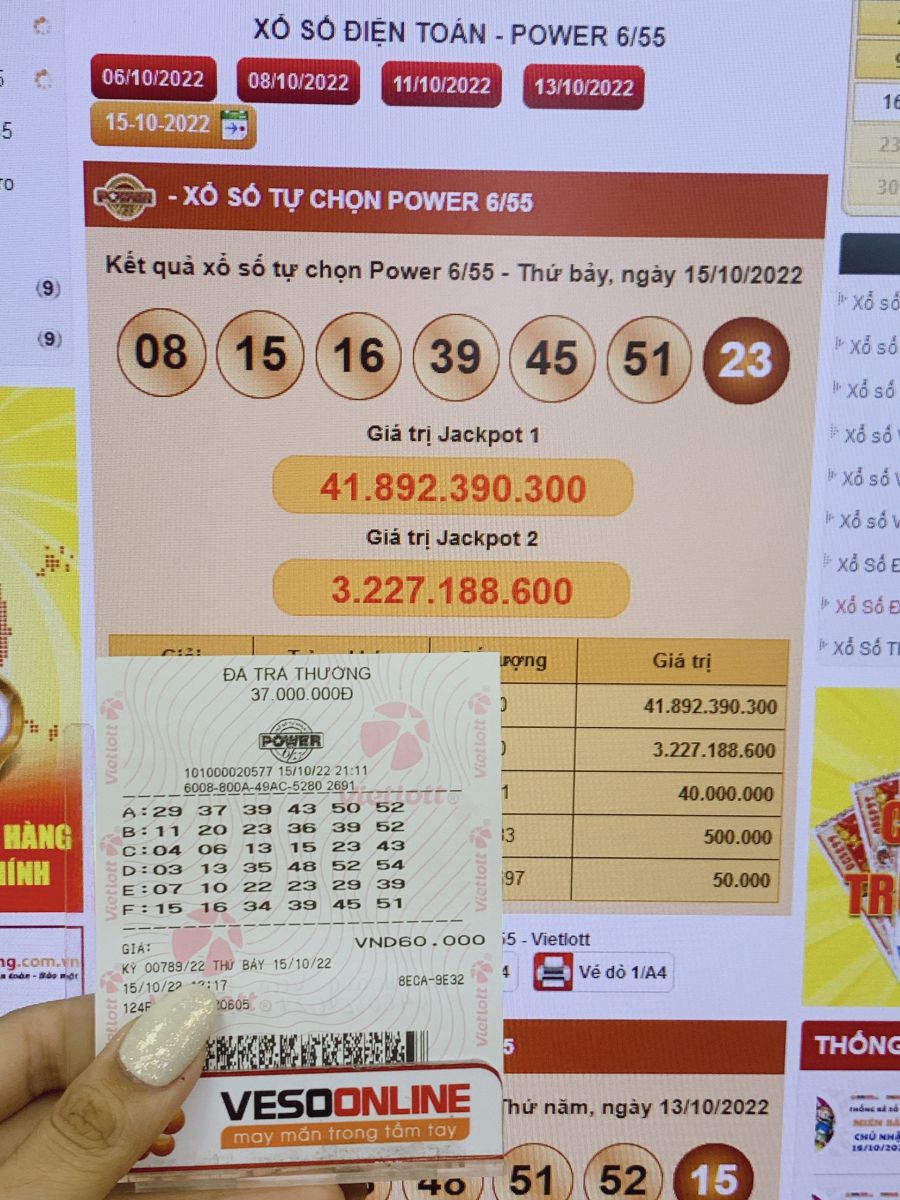 Vào kỳ quay Vietlott Power 6/55 ngày 15/10/2022 VESOONLINE đã tìm ra chủ nhân giải Nhất trị giá 40 triệu đồng (chưa trừ thuế)