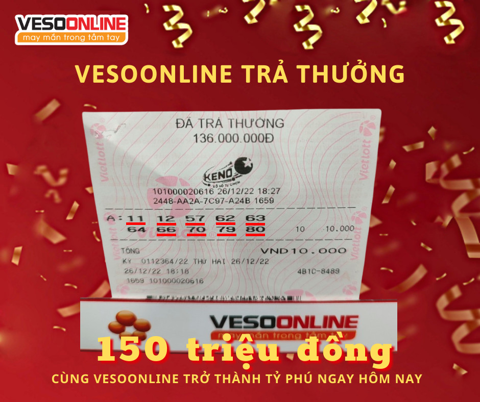 Vào kỳ quay 0112364 của KENO ngày 26/12/2022 VESOONLINE đã bán trúng tấm vé KENO bậc 10 trùng 9 số trị giá 150 triệu đồng (chưa trừ thuế)