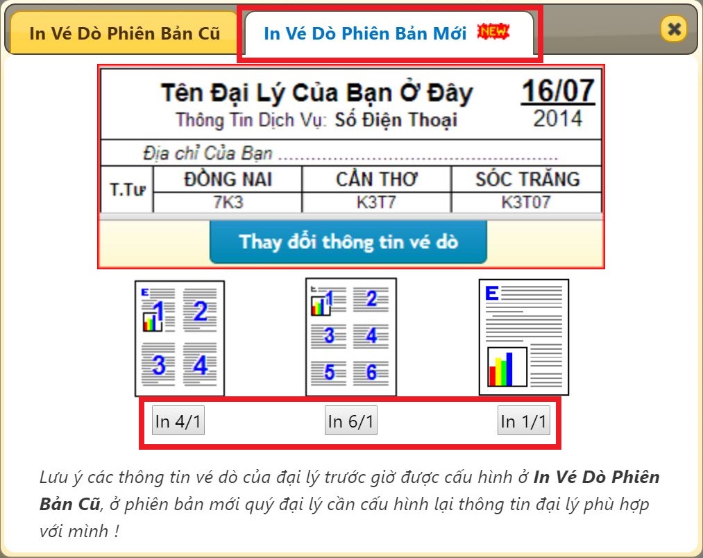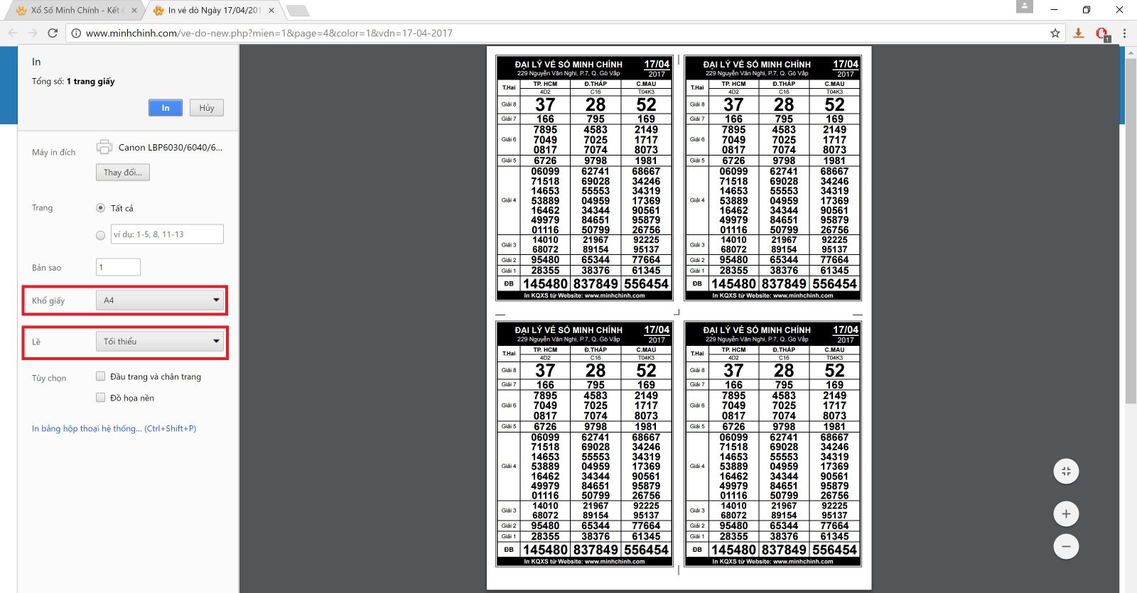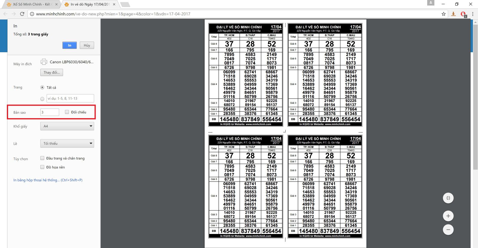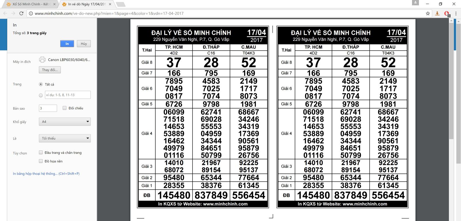 **Dưới mỗi bảng kết quả xổ số Minh Chính có nút [ In Vé Dò ] bấm vào hiện lên tùy chọn in như hình dưới.