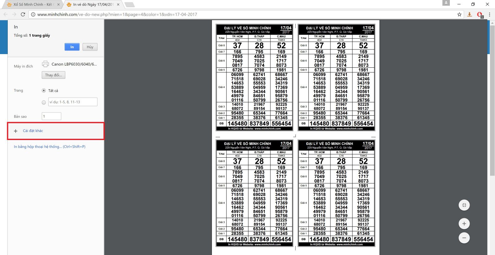 - Sau khi bấm "In Vé Dò" hãy chọn các thông số như hình bên dưới >> Bạn chọn tab "Cài Đặt Khác"