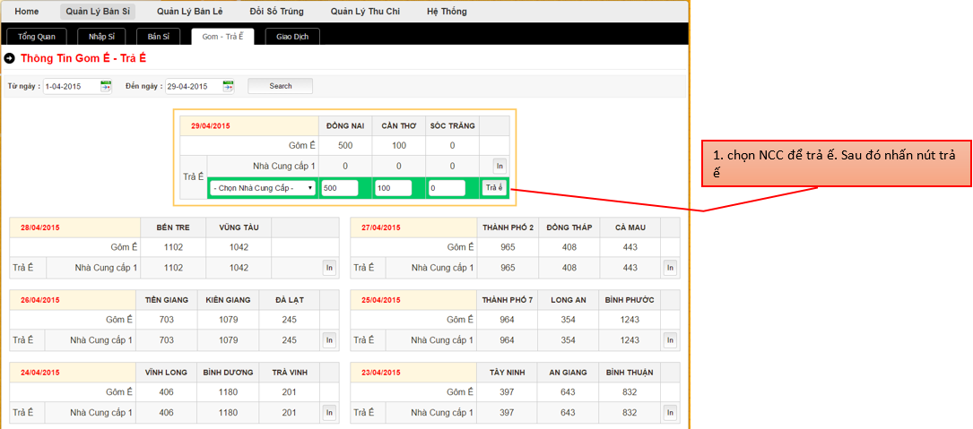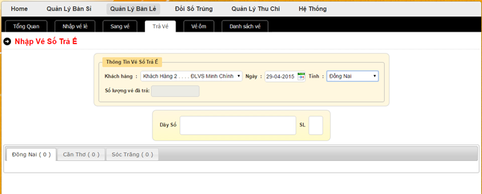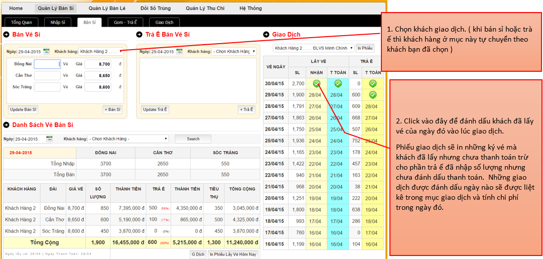 Phần này liệt kê các giao dịch được xử lý trong ngày. Bao gồm khách hàng lấy vé của ngày sau và tính vào tiền trả ế của ngày hôm đó hoặc trước đó nữa.
