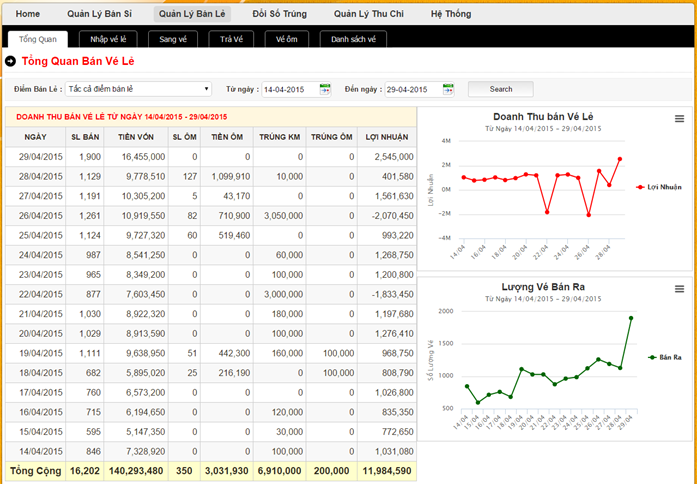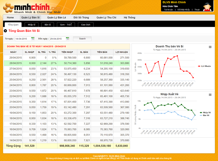 Giao diện thổng quan bán sỉ thể hiện tình trạng bán vé sỉ theo ngày và biểu đồ thể hiện tình trạng kinh doanh vé sỉ .