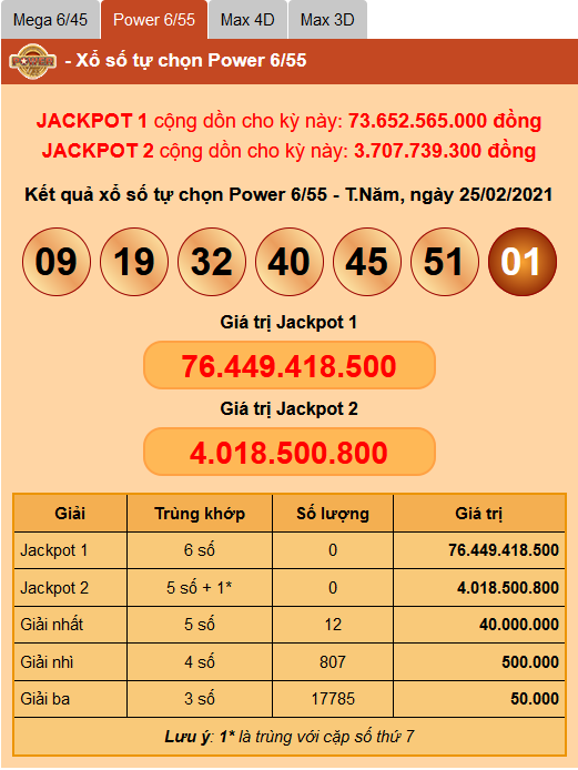 Vietlott đã thông báo kỳ quay số mở thưởng tối ngày 25-02-2021 loại hình Power 6/55 đã ghi nhận chưa có khách hàng trúng thưởng JACKPOT khiến cho giá trị giải thưởng tăng lên đến mức ~ 77 tỷ đồng