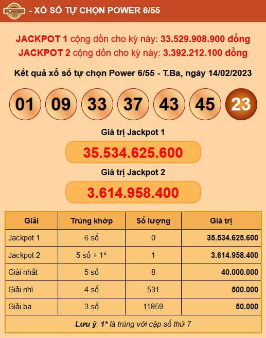 Theo kết quả xổ số loại hình Power 6/55 đã tìm ra bộ số là 01-09-33-37-43-45 và số đặc biệt 23