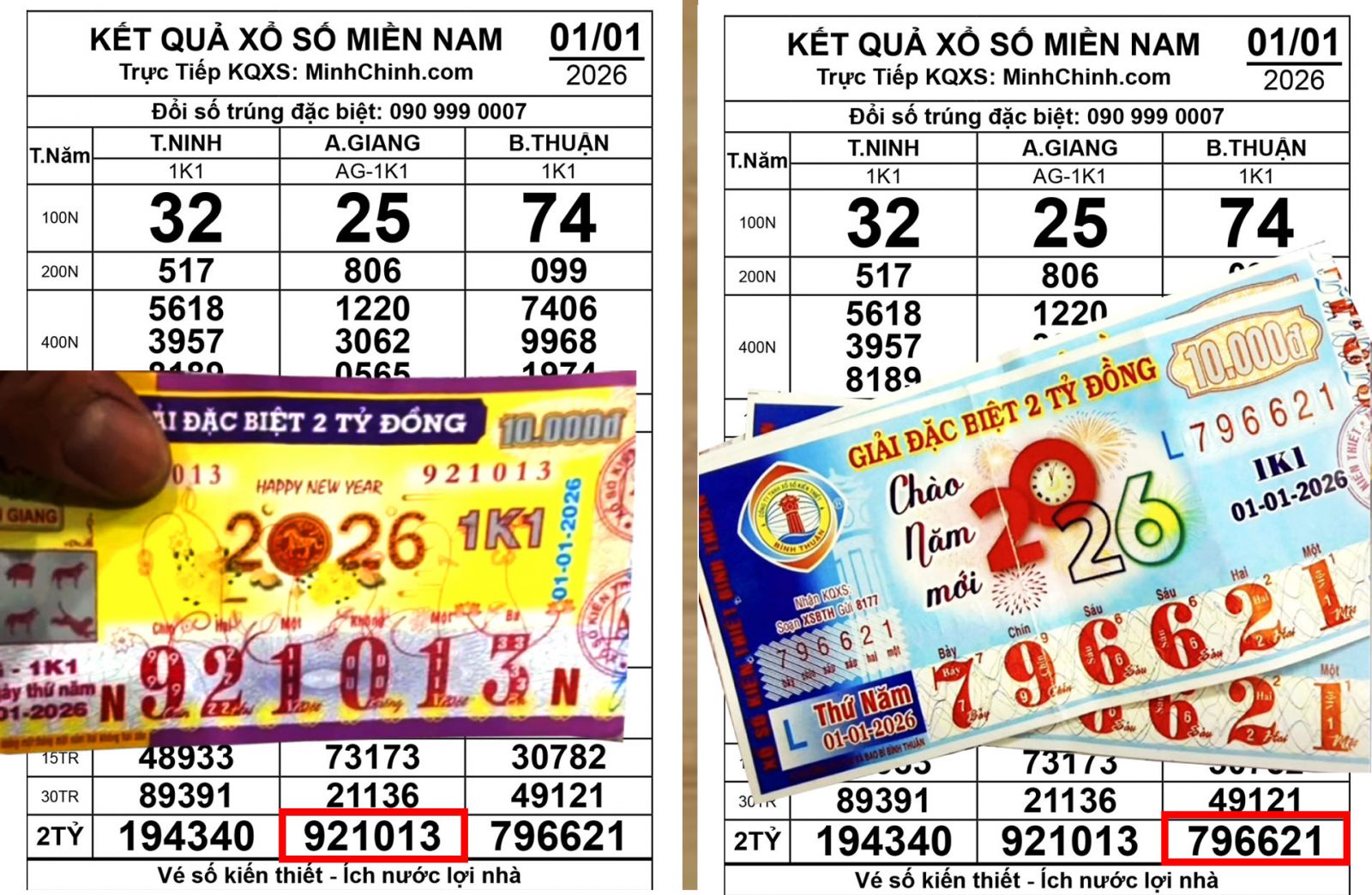 Theo kết quả xổ số miền Nam ngày 1 tháng 1 năm 2026, đại lý vé số Tấn Sỹ 78 tại Tây Ninh (Long An cũ) đã công bố hình ảnh đổi thưởng các tờ vé trúng độc đắc của đài An Giang. Những tờ vé may mắn mang cùng dãy số 921013, nhanh chóng thu hút sự quan tâm của cộng đồng người chơi.