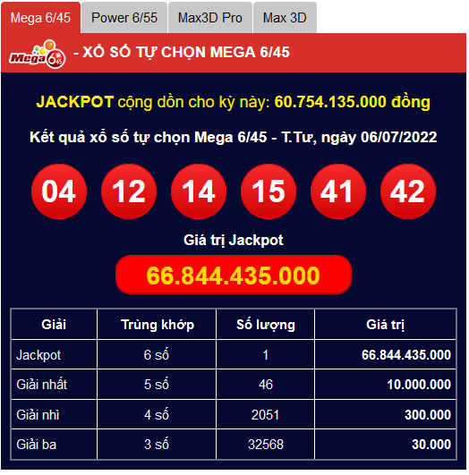 Giải độc đắc có giá trị 66.844.435.000 đồng loại hình xổ số Mega 6/45 của Vietlott đã thuộc về chủ nhân tấm vé mang dãy số 04-12-14-15-41-42. Sau khi thực hiện nghĩa vụ thuế thu nhập cá nhân, người trúng Jackpot sẽ thực lĩnh hơn 60 tỷ đồng qua hình thức chuyển khoản.