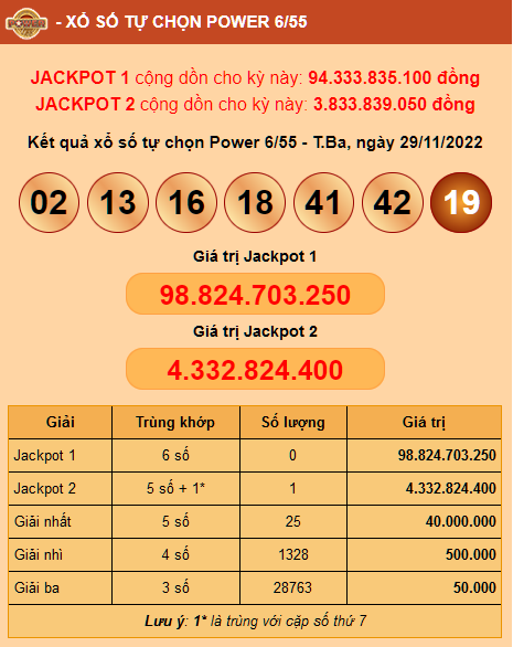Sản phẩm Power 6/55 giải thưởng trị giá 94 tỷ đồng chưa tìm thấy chủ nhân may mắn Jackpot 1. Theo kết quả xổ số loại hình Power 6/55 quay thưởng đã tìm ra bộ số may mắn là 02 - 13 - 16 - 18 - 41 - 42 và số đặc biệt 19