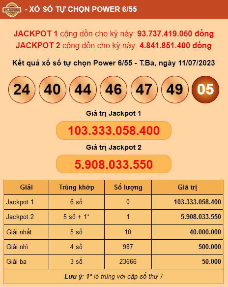 Xem thêm: Vietlott Power 6/55: Jackpot 2 ngày 01/07/2023 trị giá hơn 4 tỷ đồng tìm ra chủ nhân may mắn