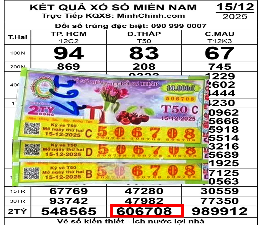 Kết quả xổ số miền Nam mở thưởng chiều 15/12 đã ghi nhận sự kiện đặc biệt khi ba giải độc đắc, mỗi giải trị giá 28 tỉ đồng, được xác định trúng tại TP HCM, TP Cần Thơ và tỉnh An Giang, với tổng giá trị giải thưởng lên đến 84 tỉ đồng.