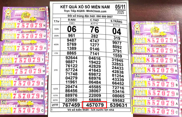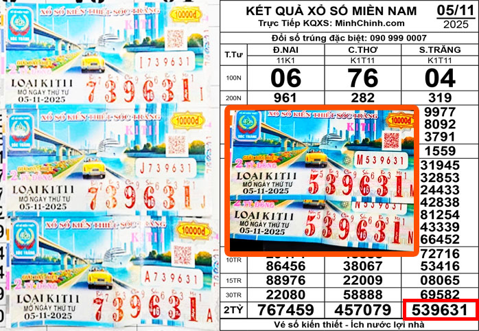 Đại lý vé số Nhựt (xã Phan Rí Cửa, tỉnh Lâm Đồng) xác nhận vừa đổi thưởng cho khách hàng trúng 2 tờ vé số Sóc Trăng giải đặc biệt, dãy số 539621, ký hiệu K1T11, do Công ty TNHH MTV Xổ số kiến thiết Sóc Trăng mở thưởng ngày 5/11.