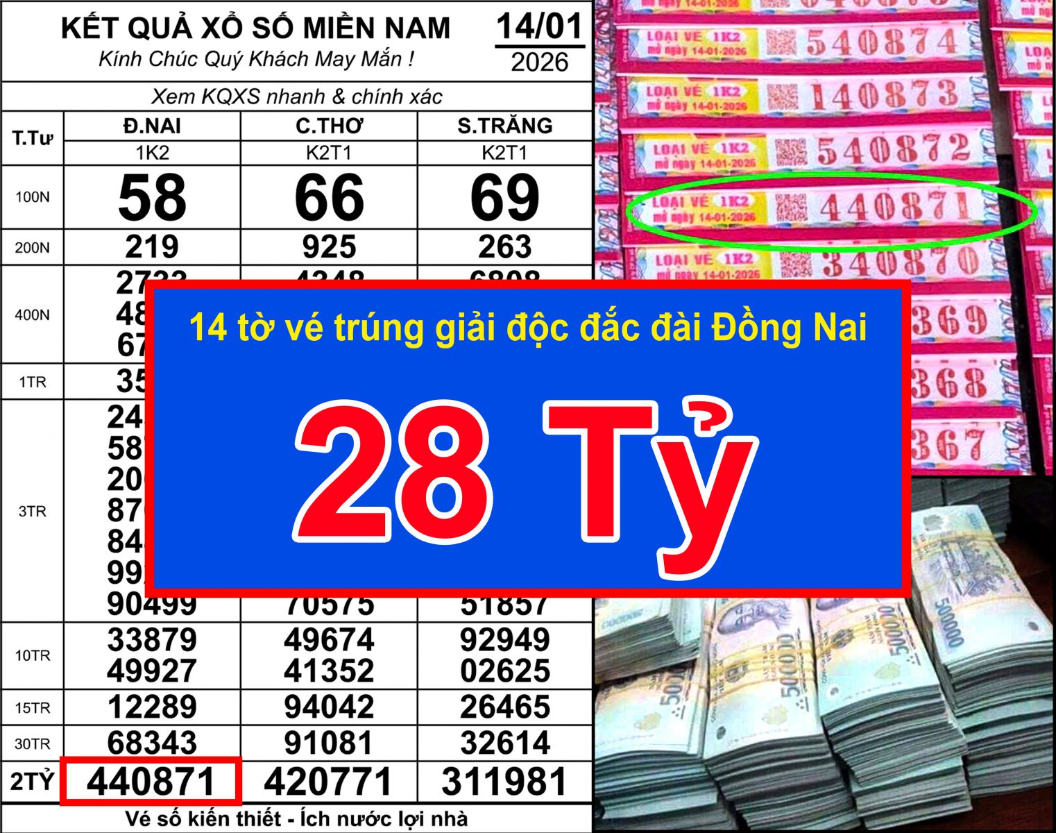 Theo xác nhận từ đại lý vé số Minh Chính, đơn vị này vừa bán trúng 14 tờ vé số độc đắc mang dãy số 440871, thuộc đài Đồng Nai. Tổng giá trị giải thưởng của 14 tờ vé là 28 tỉ đồng (chưa trừ thuế).