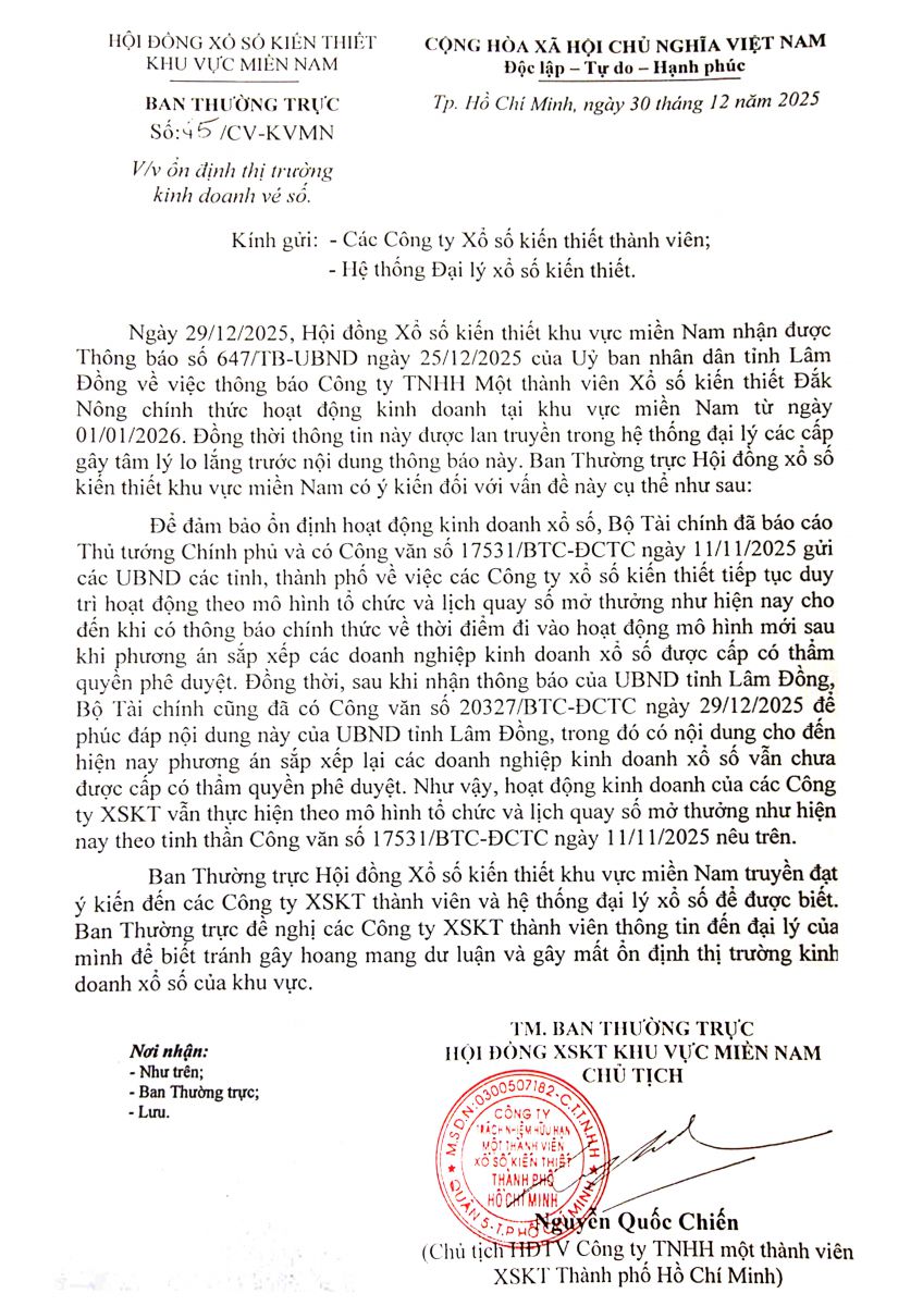 Ngày 30/12/2025, Ban Thường trực Hội đồng Xổ số kiến thiết khu vực miền Nam đã ban hành Công văn số 45/CV-KVMN về việc ổn định thị trường kinh doanh vé số, gửi đến các Công ty XSKT thành viên và hệ thống Đại lý xổ số kiến thiết.
