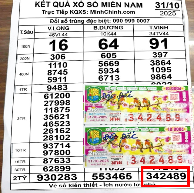Không chỉ vậy, đại lý Phước Danh còn vừa tiếp tục đổi thưởng hai tờ vé số trúng độc đắc khác, cùng dãy số 342489 của đài Trà Vinh, mở thưởng ngày 31/10, tổng giá trị 4 tỉ đồng (chưa trừ thuế).