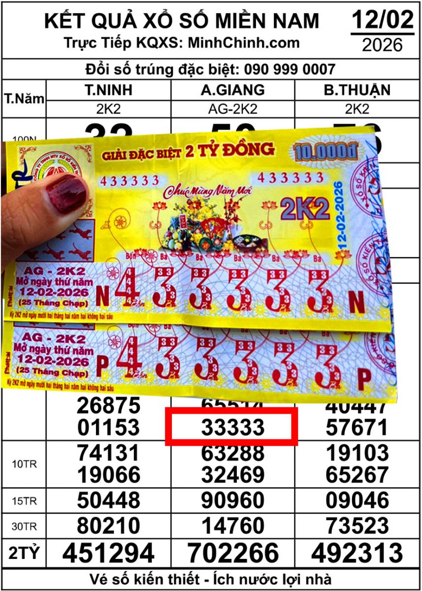Theo thông tin từ đại lý vé số Bến Đá, hai tờ vé có 5 số cuối 33333 đã trúng giải tư xổ số An Giang trong kỳ mở thưởng ngày 12-2, mỗi vé trị giá 3 triệu đồng.