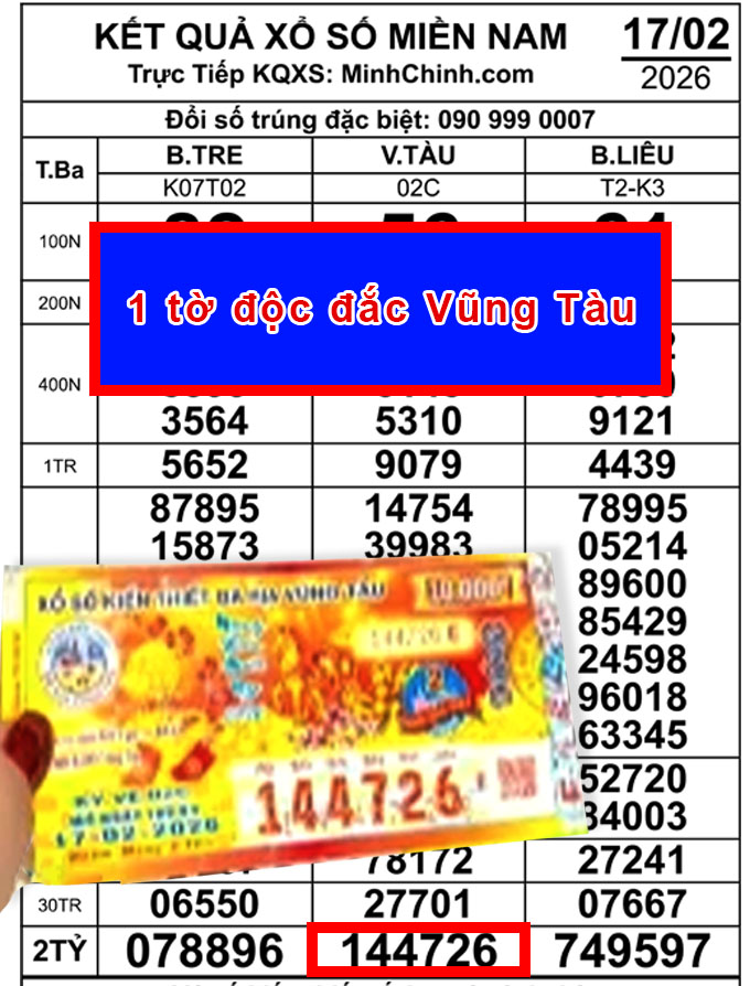 Theo thông tin từ đại lý Hải Diệu 2 (Đồng Nai), tờ vé số mang dãy số 144726, thuộc đài Vũng Tàu mở thưởng ngày 17-2, trúng giải đặc biệt trị giá 2 tỉ đồng (chưa khấu trừ thuế theo quy định).