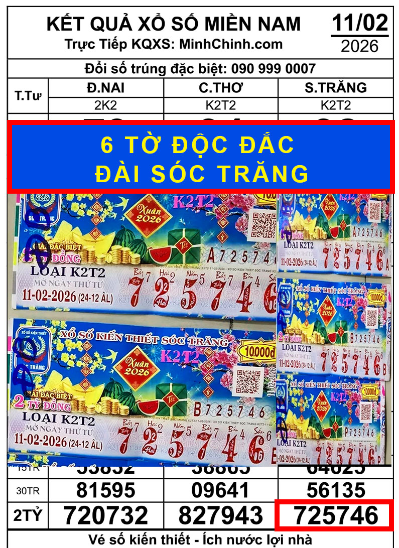 Trong kỳ quay chiều 11-2, vé số Sóc Trăng xác định dãy số trúng độc đắc là 725746. Theo thông tin từ các đại lý, vé trúng được bán ra tại tỉnh Cà Mau.