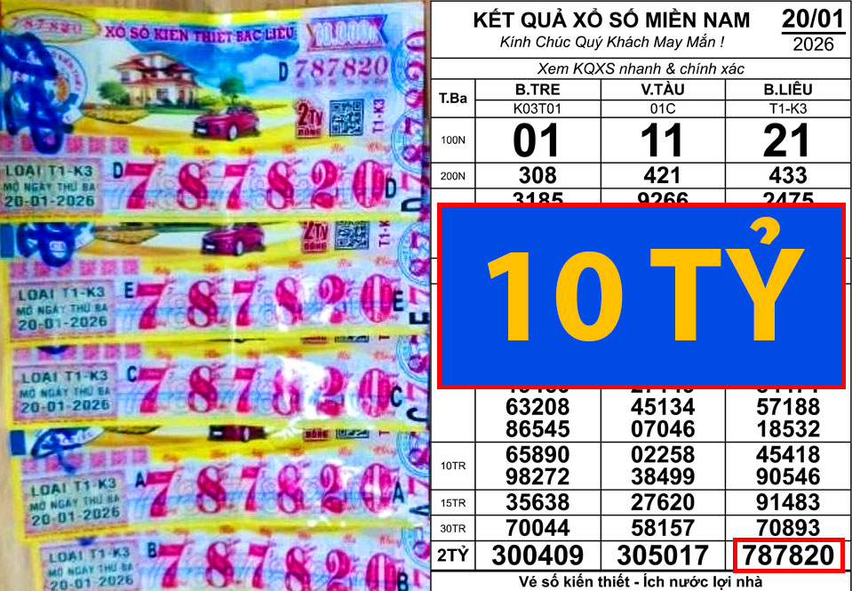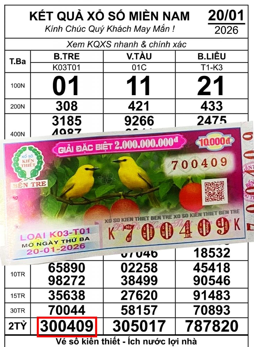 Sáng 21-1, kết quả xổ số miền Nam cho thấy đã xuất hiện vé trúng độc đắc của hai đài Bến Tre và Bạc Liêu trong kỳ mở thưởng ngày 20-1.