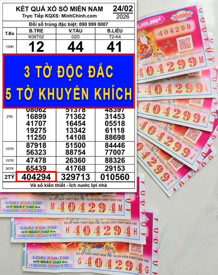 Vé số Bến Tre mở thưởng ngày 24-2 với dãy số đặc biệt 404294, được xác định trúng tại tỉnh Lâm Đồng.