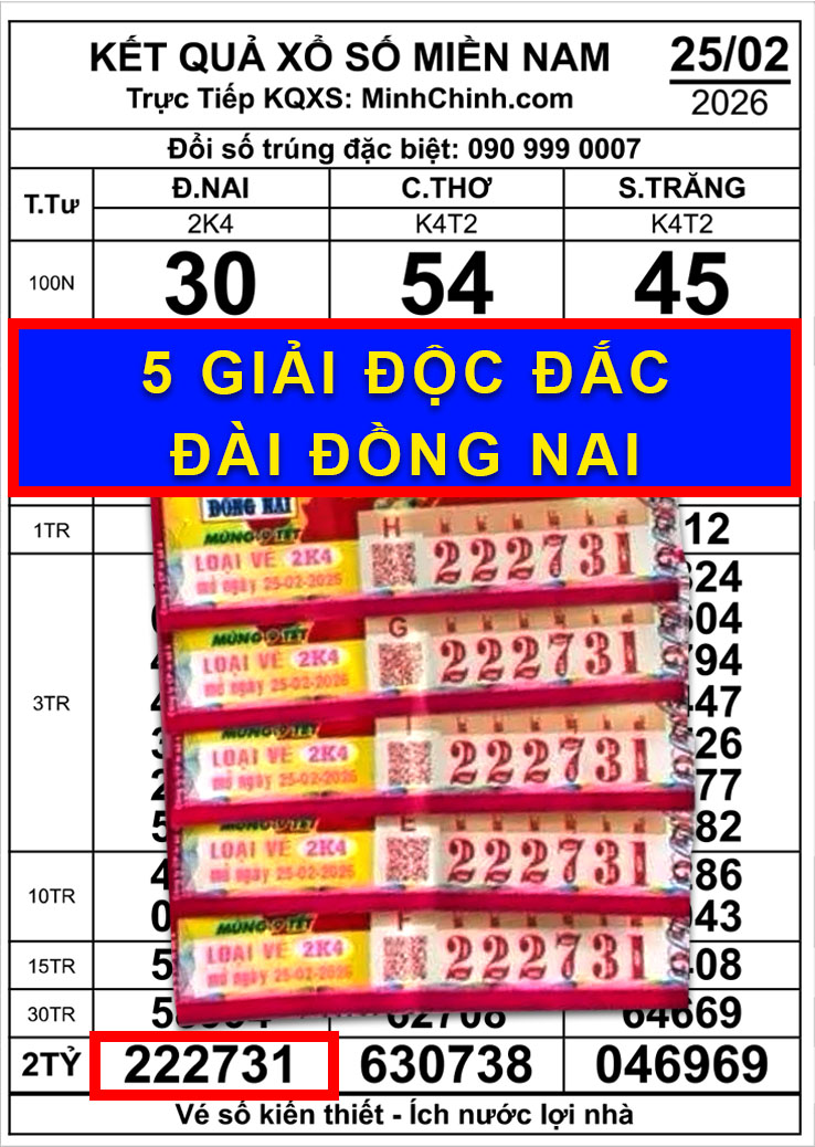 Trong khi đó, vé số Đồng Nai mở thưởng ngày 25-2 với dãy số đặc biệt 222731 được xác định trúng tại tỉnh Đồng Nai.