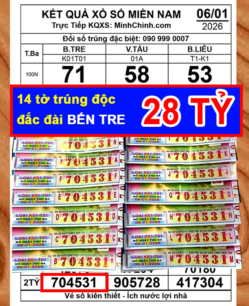 Theo ghi nhận, ngay trong đêm sau kỳ mở thưởng, nhiều đại lý vé số đã chia sẻ thông tin xác nhận giải độc đắc dãy số 704531 của vé số Bến Tre, do Công ty TNHH MTV Xổ số kiến thiết Bến Tre mở thưởng chiều 6/1, đã có người trúng tại tỉnh Vĩnh Long. Địa điểm đổi thưởng là đại lý vé số Duy tại phường Trà Vinh – nơi thời gian gần đây liên tục ghi nhận các trường hợp trúng độc đắc.