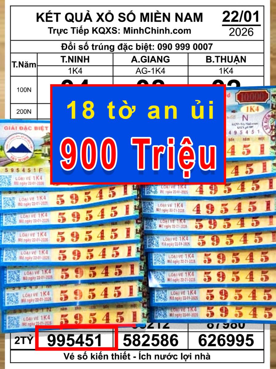 Kết quả xổ số miền Nam mở thưởng ngày 22 tháng 1 ghi nhận hai giải đặc biệt của các đài trong khu vực được xác định trúng tại tỉnh Tây Ninh, thu hút sự quan tâm của người theo dõi kết quả xổ số.