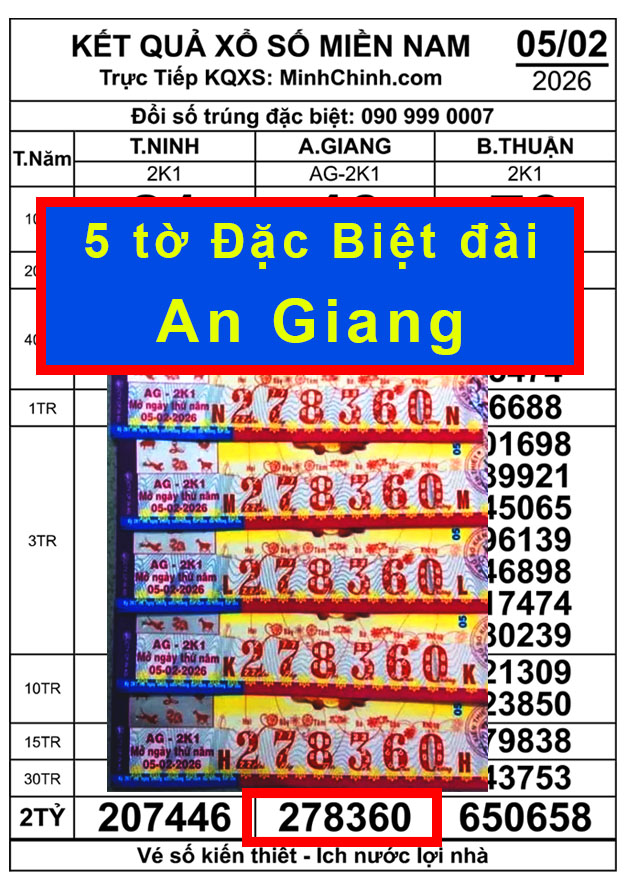 Cụ thể, vé số An Giang mở thưởng chiều 5-2 đã xác định dãy số trúng giải độc đắc là 278360, với vé trúng được ghi nhận tại tỉnh Đồng Tháp. Chủ nhân đầu tiên trúng 5 vé độc đắc đã đến đại lý vé số Tùng Hiếu tại Gò Công, tỉnh Đồng Tháp để làm thủ tục đổi thưởng. Hiện vẫn còn 9 vé độc đắc An Giang chưa đến nhận thưởng và đang được các đại lý tiếp tục thông báo, tìm chủ nhân.