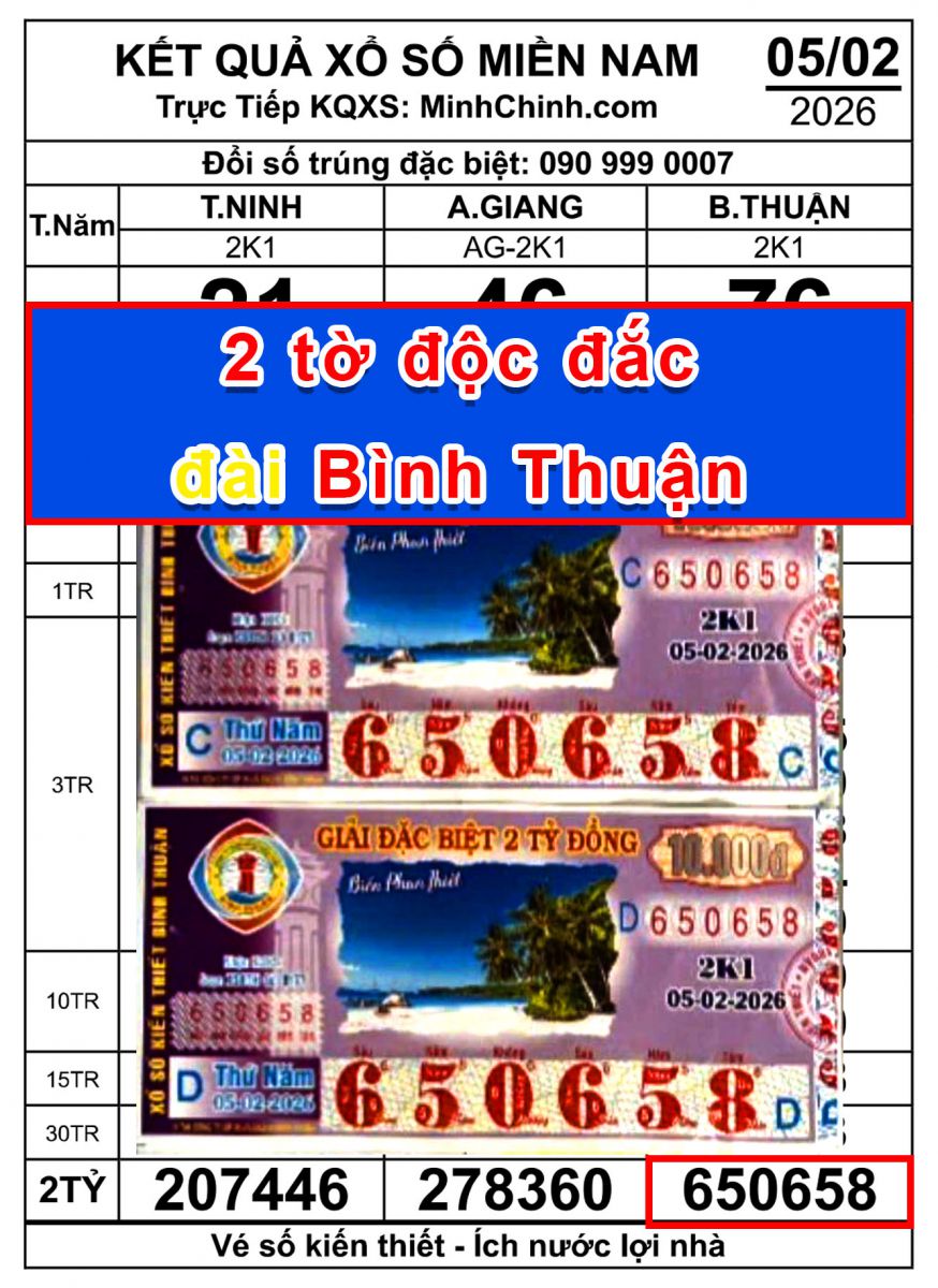 Cùng ngày mở thưởng với vé số An Giang, vé số Bình Thuận xác định dãy số trúng giải độc đắc là 650658, được ghi nhận trúng tại tỉnh Vĩnh Long. Đến chiều 6-2, một chủ nhân may mắn trúng 2 vé độc đắc Bình Thuận đã đến đại lý vé số Phú Vinh, phường Trà Vinh, tỉnh Vĩnh Long để đổi thưởng và nhận số tiền 4 tỉ đồng (chưa trừ thuế).