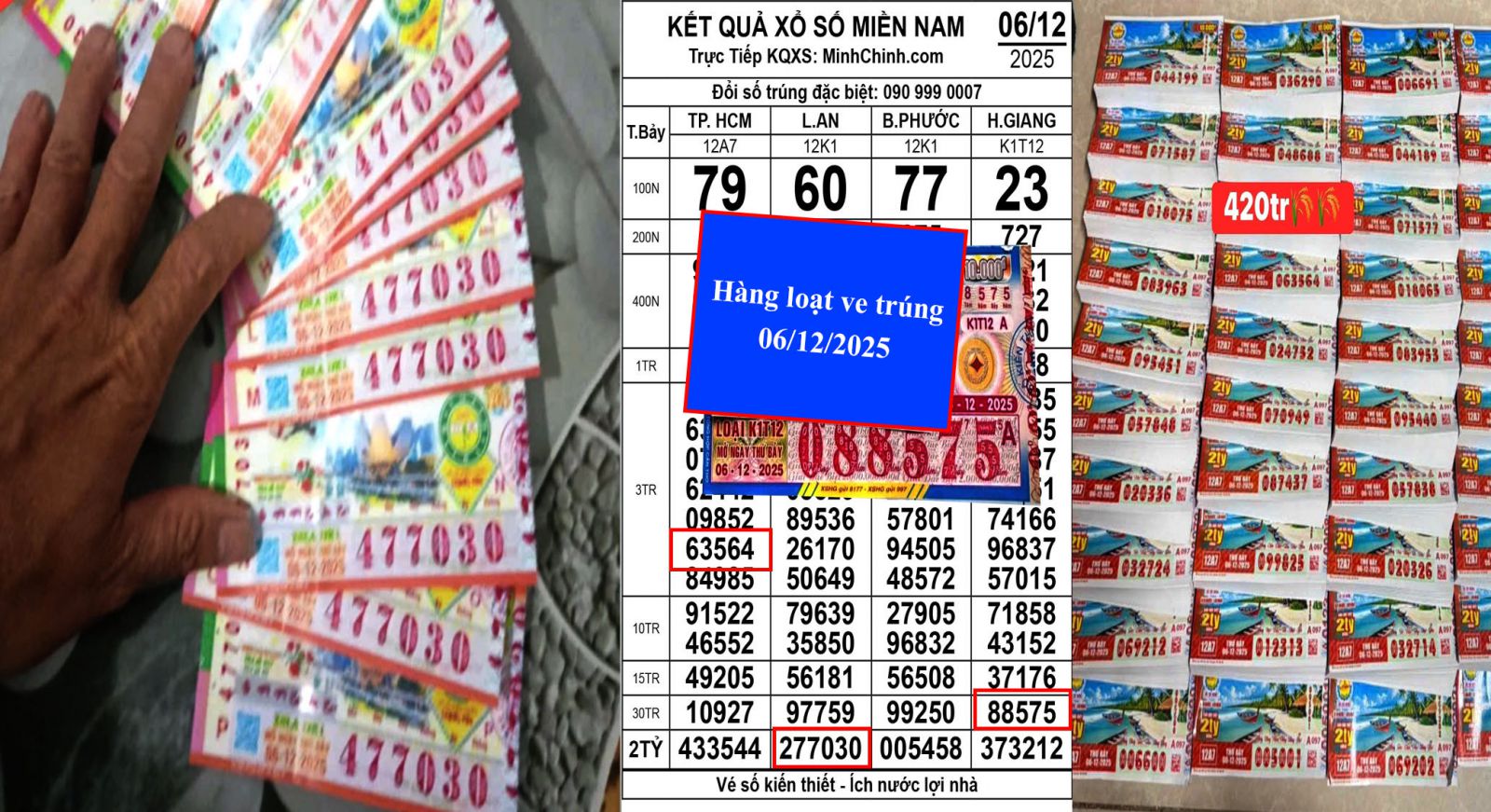 Kết quả xổ số miền Nam ngày 6 tháng 12 ghi nhận loạt vé trúng lớn tại các đài Hậu Giang, TP.HCM và Long An. Tổng cộng ba “cây vé” với 420 tờ đã mang về hơn 5 tỉ đồng cho người chơi, đồng thời giúp nhiều đại lý xác nhận bán trúng.