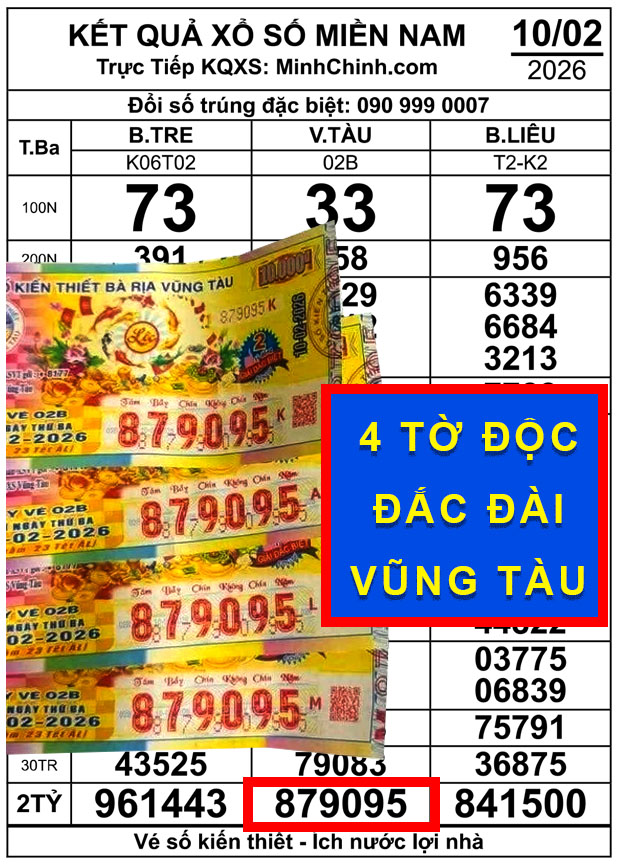 Trong khi đó, vé số Bến Tre mở thưởng cùng ngày xác định dãy số trúng giải độc đắc là 961443. Tuy nhiên, đến sáng 11-2 vẫn chưa có thông tin về địa phương có khách hàng trúng giải độc đắc trị giá 32 tỉ đồng.