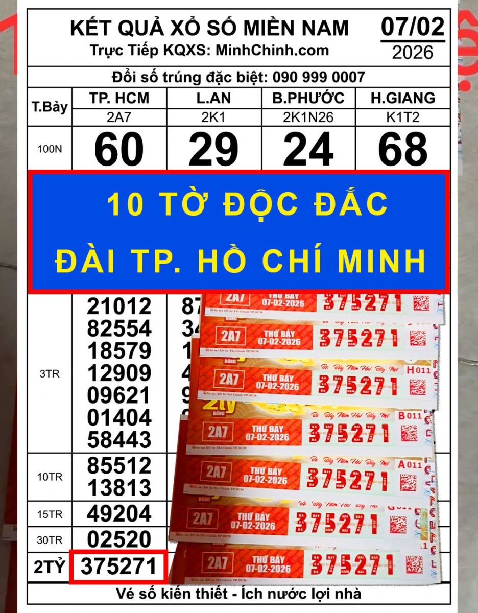 Trong tuần qua, nhiều đài xổ số miền Nam đã xác định vé trúng độc đắc bán ra tại TP.HCM. Cụ thể, vé số Đà Lạt (dãy số 399829), Cà Mau (713376), Vũng Tàu (994417), Đồng Nai (636838), Tây Ninh (207446), Vĩnh Long (799293) và Bình Phước (455282) đều ghi nhận trúng độc đắc tại TP.HCM.