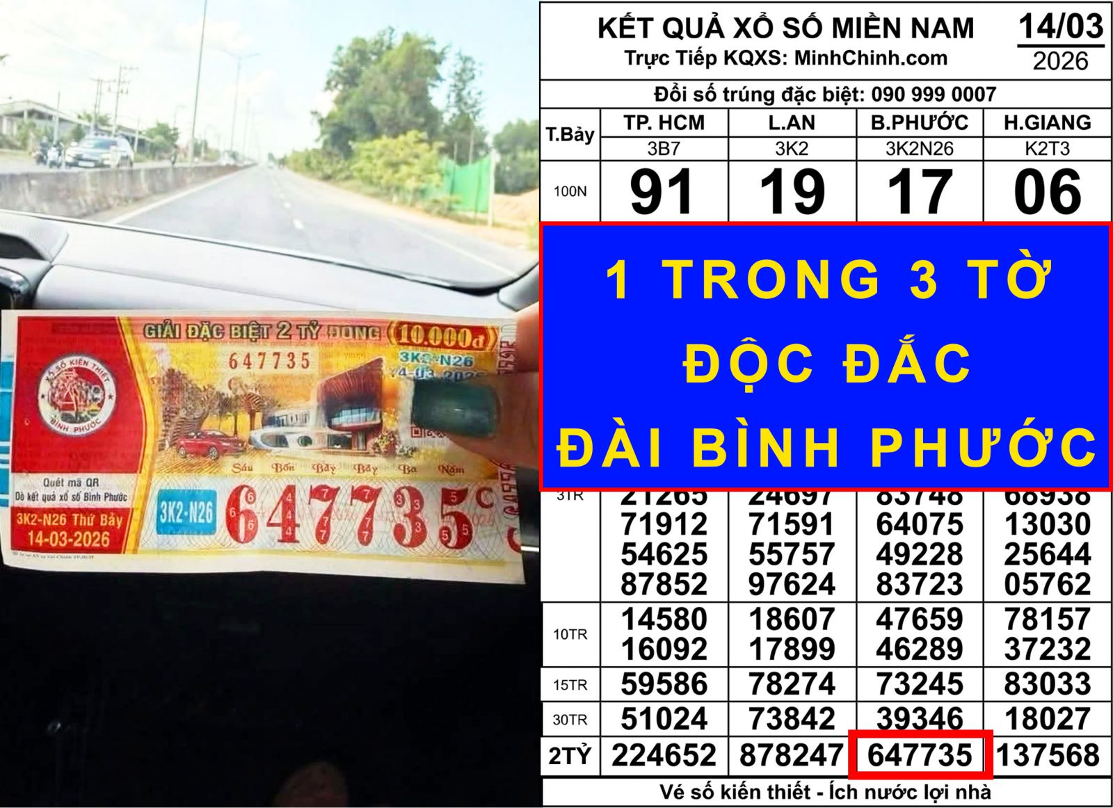 Cụ thể, các tờ vé mang dãy số 647735 thuộc đài Bình Phước, mở thưởng ngày 14-3, mỗi vé trị giá 2 tỉ đồng, tổng cộng 6 tỉ đồng (chưa trừ thuế).