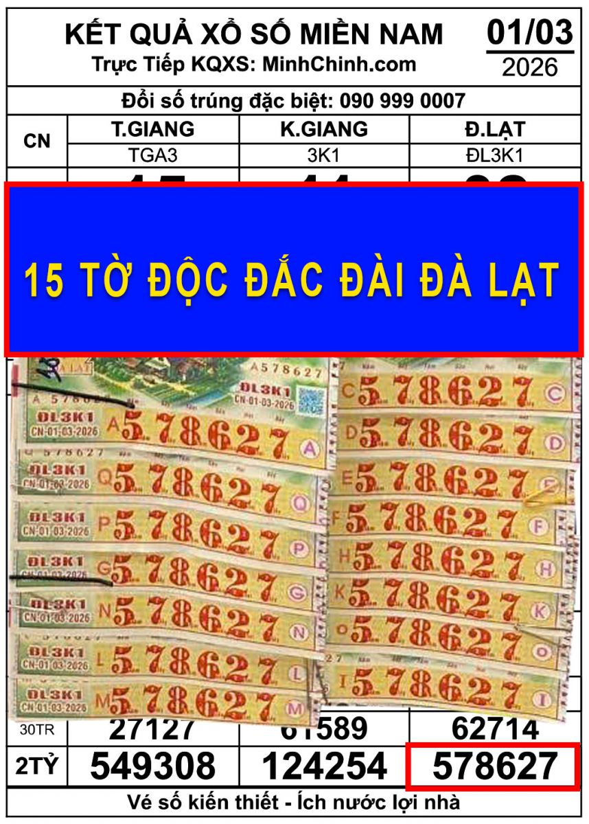 Trước đó, tối 1-3, đại lý Duy (phường Trà Vinh, Vĩnh Long) đã đổi thưởng cho một nữ khách hàng trúng 15 vé Đà Lạt với dãy số 578627. Hiện còn 1 vé trúng độc đắc Đà Lạt chưa ghi nhận người nhận.