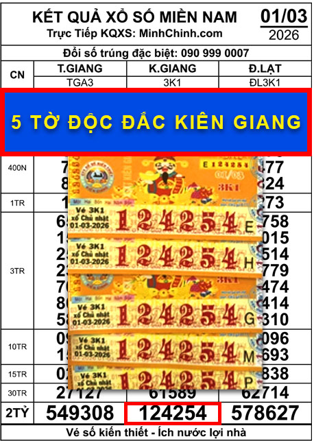 Cùng kỳ mở thưởng, Công ty TNHH MTV Xổ số kiến thiết Kiên Giang công bố dãy số đặc biệt 124254, được xác định trúng tại tỉnh An Giang.