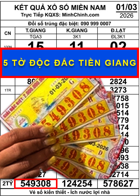Công ty TNHH MTV Xổ số kiến thiết Tiền Giang mở thưởng chiều 1-3 với dãy số đặc biệt 549308, được xác định trúng tại tỉnh Tây Ninh.