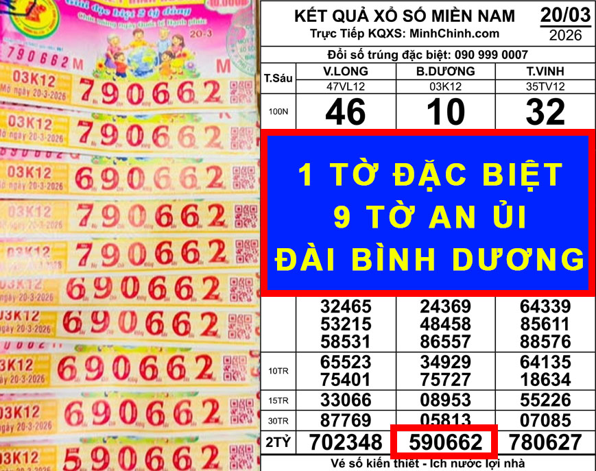 Vé số Bình Dương (590662), mở thưởng ngày 20-3, được xác định trúng tại TP.HCM.